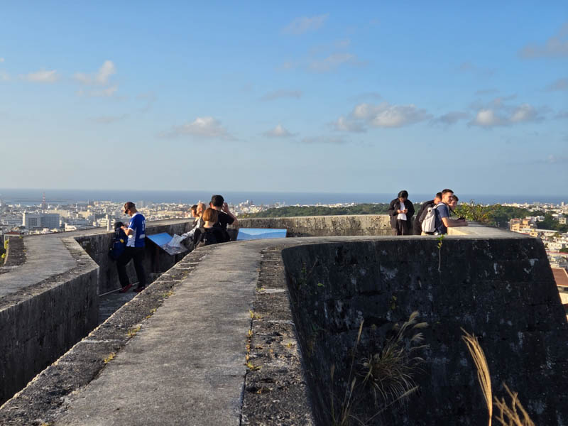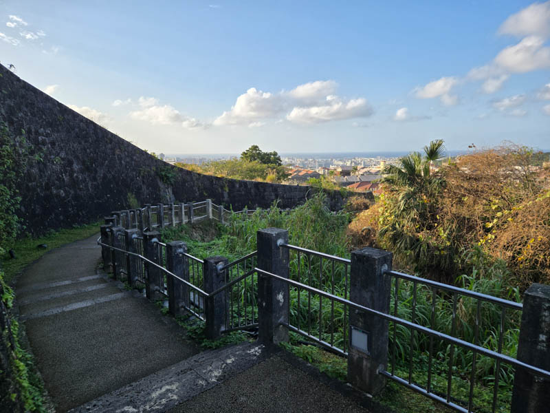 しばらく寛いで、16時すぎにホテルを出発します。ゆいレールに乗って向かった先は首里駅です。そこから向かう先はもちろん首里城です。前回訪れたのは12年ちょい前ですね。ほとんど記憶がありません。そして火災発生以降は初めての訪問です。短い時間で移動できる城壁の北側のコースを歩いていきます。高台から海を望めるので、気持ちいい光景の中を進んでいきます。