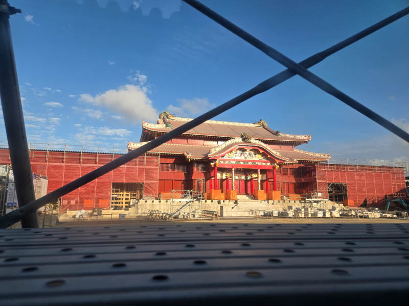 正面に守礼門が見えてきたら、折り返して坂を登り、歓礼門を通過します。歓礼門はまだ復興作業中です。その後も幾つか門をくぐって進んでいくと、有料区画となりますのでチケットを購入して入場します。正殿は火災からの再建作業中のため近くで見ることはできませんが、パネル越しにその様子を望むことができます。