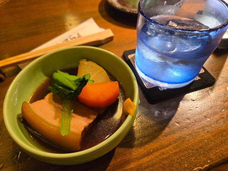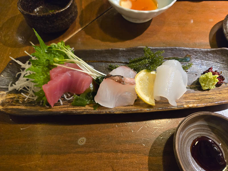 ゆいレールで美栄橋駅まで戻ってきたら、海のちんぼらぁにて夕食をいただきます。明日は朝に余裕があるので、好きに飲み食いします。まずオリオンドラフトを頼み、ミミガーのポン酢和えと地魚三種盛ハーフをいただきます。