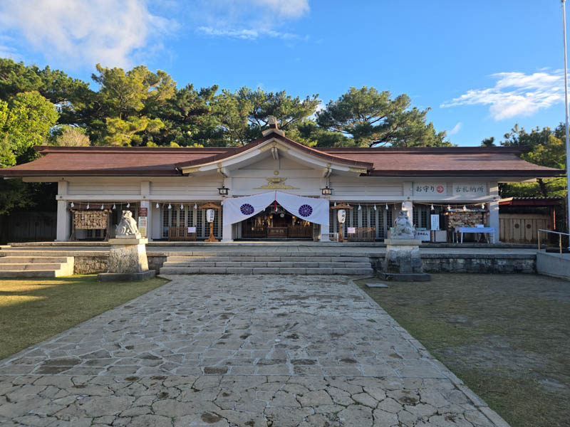 園内をのんびり歩き回ります。昼間は日が出ると少し暑いくらいですが、夕方が近づいてくるととても過ごしやすい気温になります。散策している途中で見つけた、琉球八社の1つである沖宮を参拝しました。