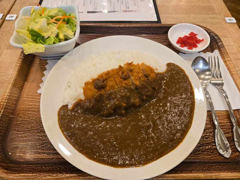 チェックイン手続きを済ませて身軽になったら、風月にて夕食をいただきます。アグー豚のカツカレーライス大盛とミニサラダを注文しました。豚カツが甘くて美味しかったです。
