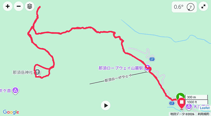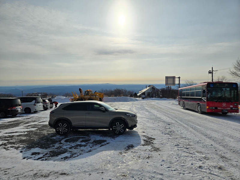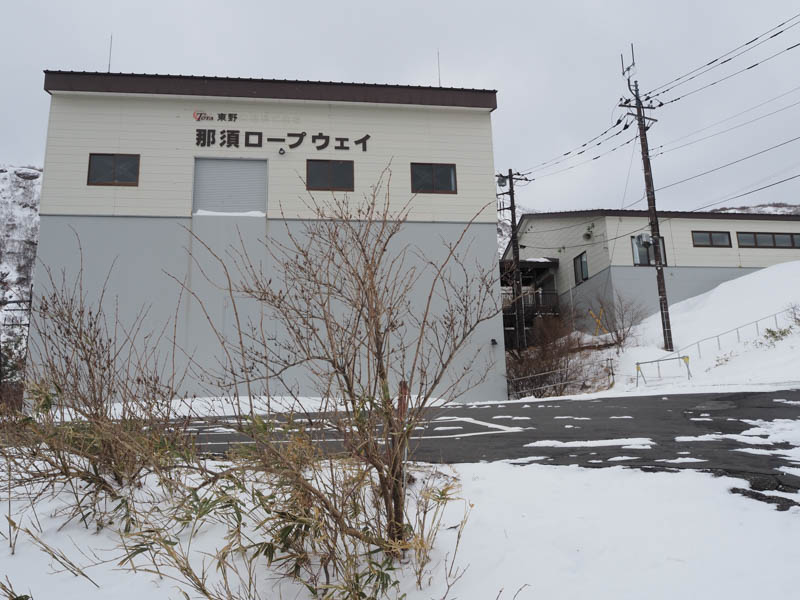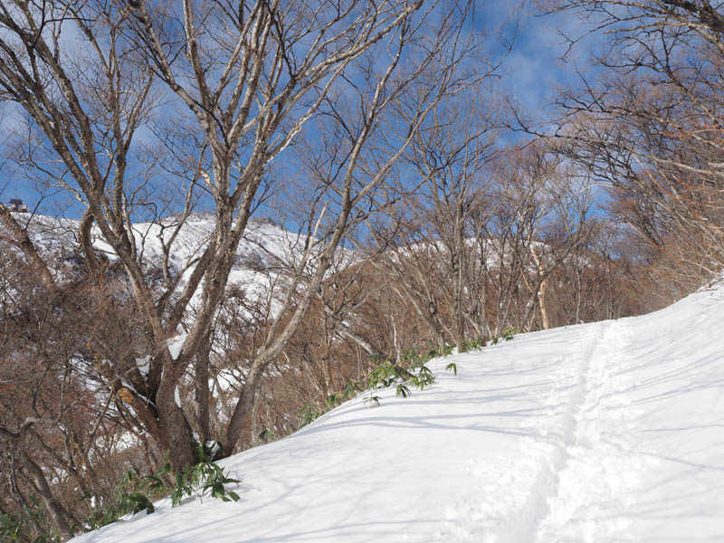 やがて冬期休業中のロープウェイ山麓駅に出合います。舗装路は除雪されているので、雪伝いに行くのが大変です。茶臼岳を正面に望みつつ、再び山道へ入っていきます。南は雲っているけど北は晴れている状況です。