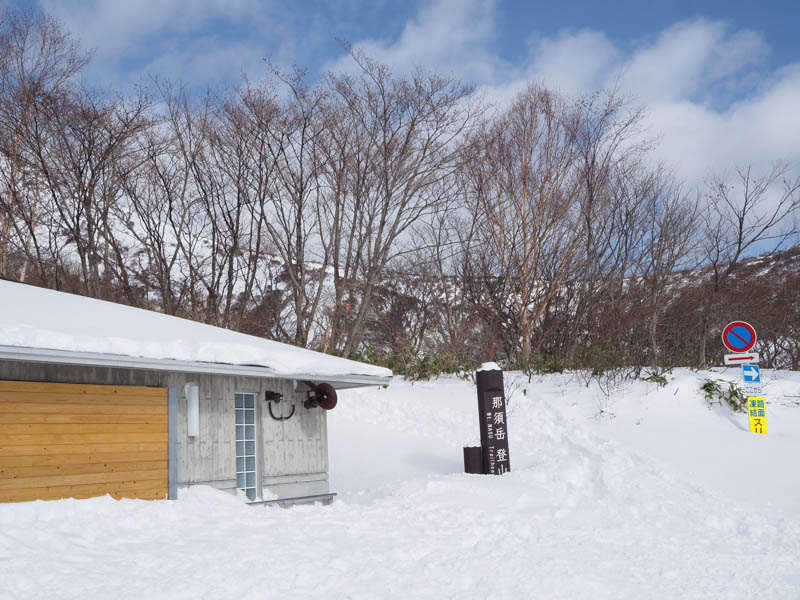 しばらく歩いたら峠の茶屋駐車場に着きました。ここは雪が積もっているものの全体的に浅く、ワカンの刃が路面に当たって歩きにくいです。少しでも雪が厚いところを歩きます。駐車場の奥に那須岳登山口の標柱があります。ここから本格的に登山道となります。