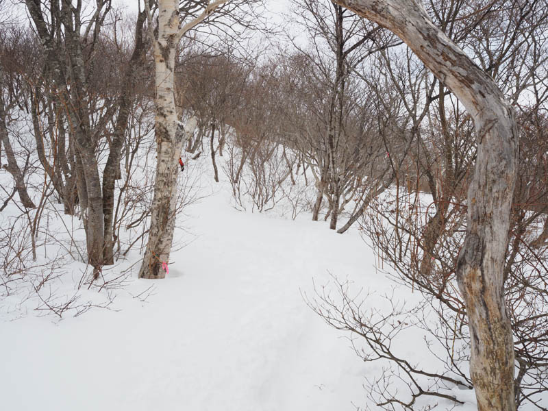 樹林帯を抜けると左手には茶臼岳、右手には朝日山がその姿を現します。この辺りから岩が増えてきて、雪が少なくなってきました。ワカンだとかなり歩きにくくなってきたので、アイゼンに履き替えました。アイスバーンもほぼないので、何も履かなくても良いかと思いつつ、さすがにリスキーなので止めました。チェンスパ持ってくれば良かったなあ。天気は曇り主体でたまに晴れ間が見えるといった状況です。