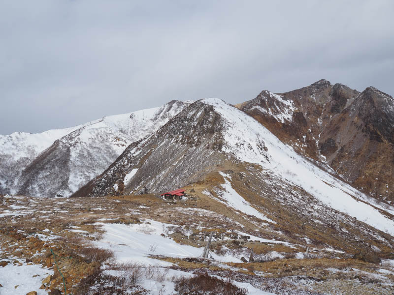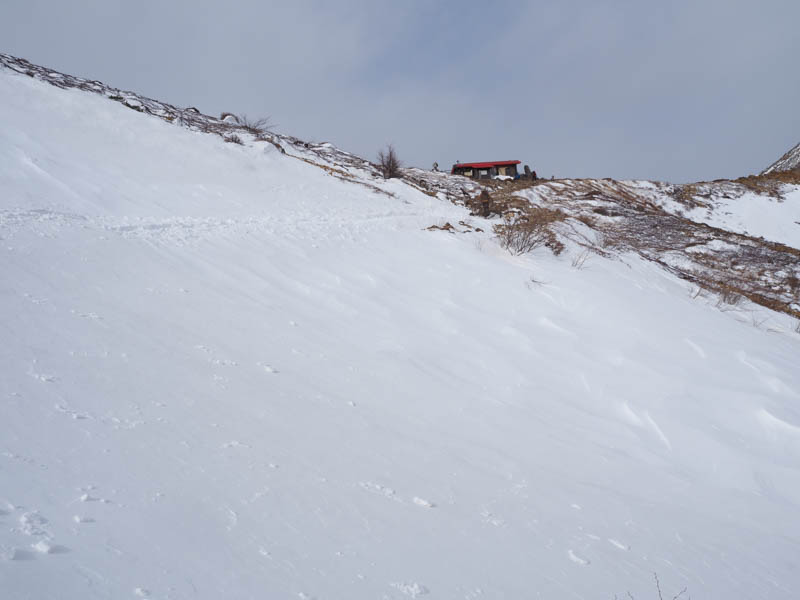 避難小屋に着いたら、風が強いので小屋の陰に隠れます。以前に秋山登山した際もここは強風だった記憶があります。ちょうど風の通り道なのでしょう。さながら風の谷です。そのため雪も吹き飛ばされて、地表が露になっている箇所が多いです。しかし避難小屋の冬期出入口は高い位置に設置されており、積もる時はがっつり積もるのだと思います。今年は雪が少ないんですかねえ。
