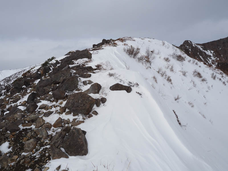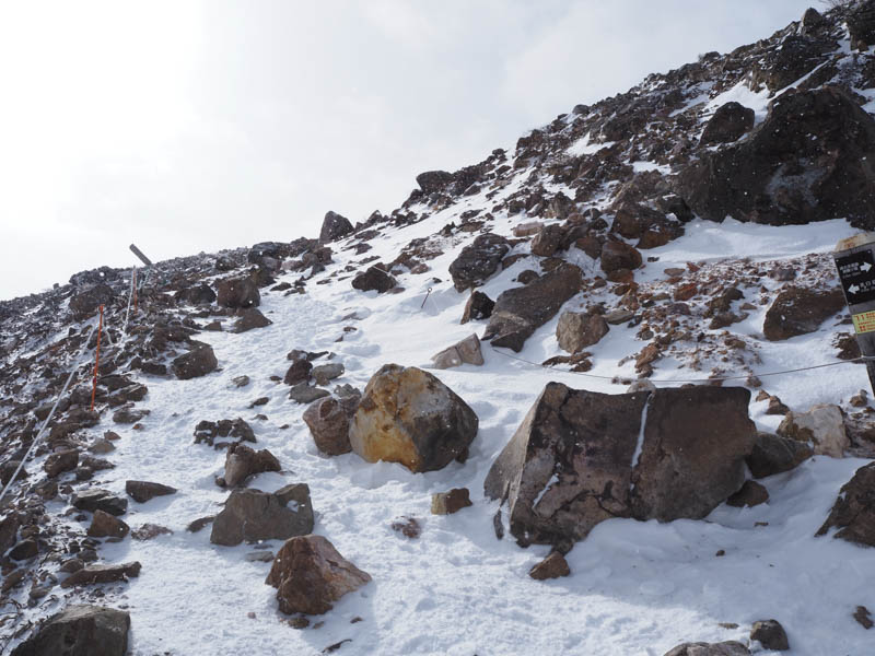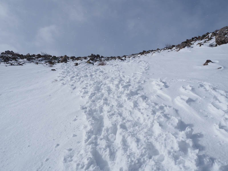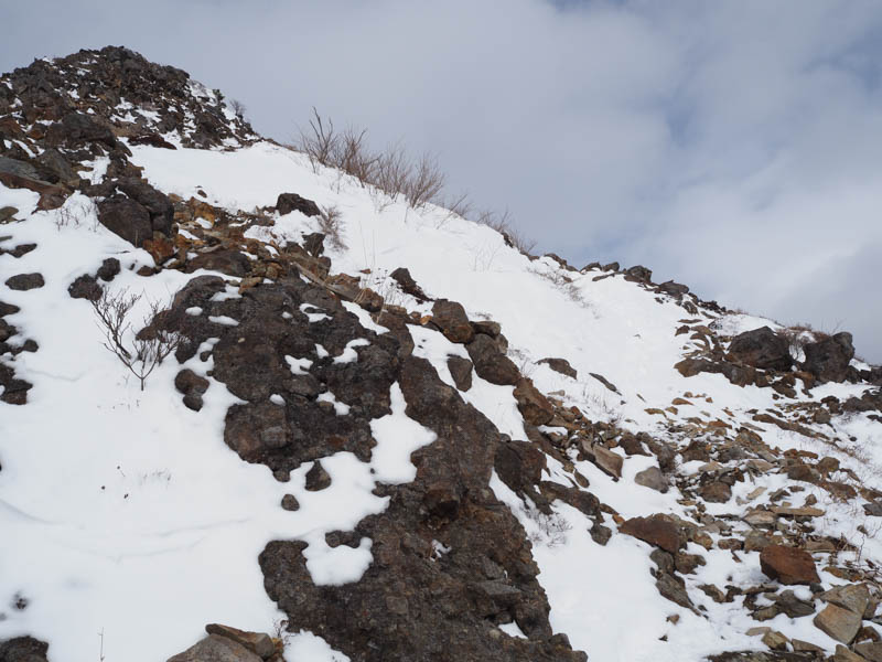 だいぶ雪が少なくて、序盤はザレ場を登っていきます。ザレ場はザレ場でアイゼンの刃が効いている感じです。途中から斑に雪が付き始めるので、その上を歩いていきます。先行者によるトレースがついていますので、それに倣います。斜度は30度くらいですかね。ところどころ地表が露出していることもあり、方向を誤らなければ斜面を真っ逆さまということはなさそうです。