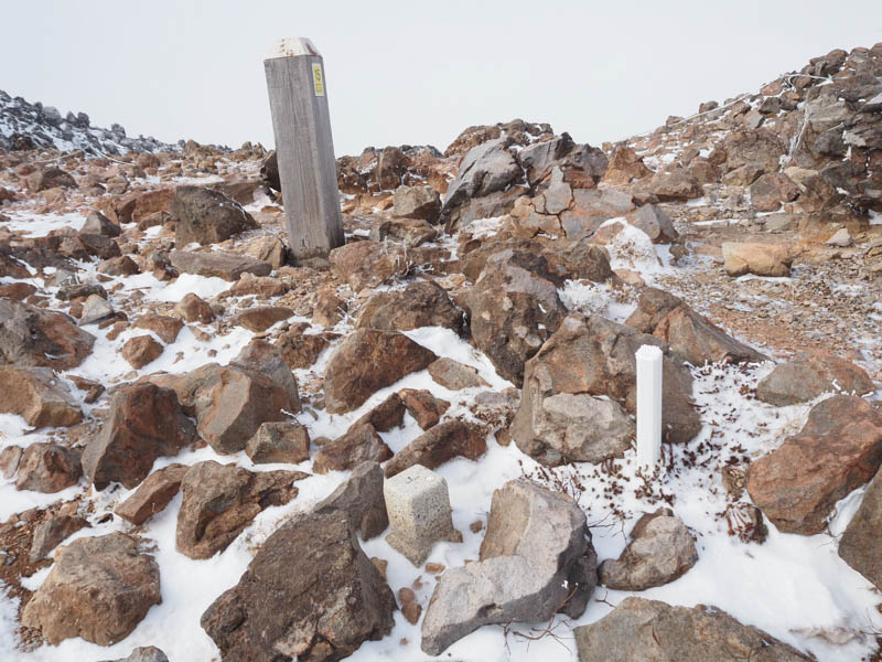 山頂エリアに着いたら、お鉢周りをします。時計回り方向で進んでいくと、三角点が現れます。この時は風は穏やかでしたが、基本的に風が強い場所のようで、小さなエビのしっぽが標識などに見られます。そして中央を覗くと広大な火口の姿を捉えることが出来ます。池がすっかり凍りついています。