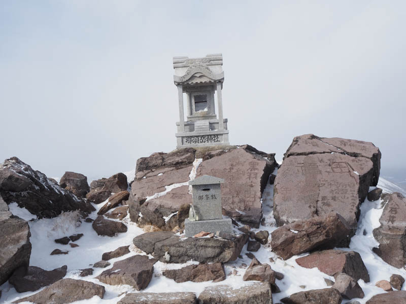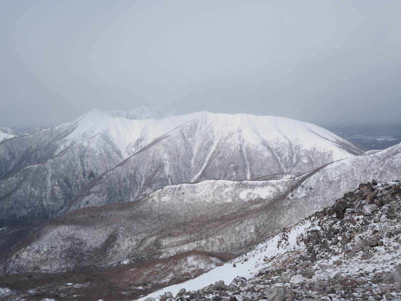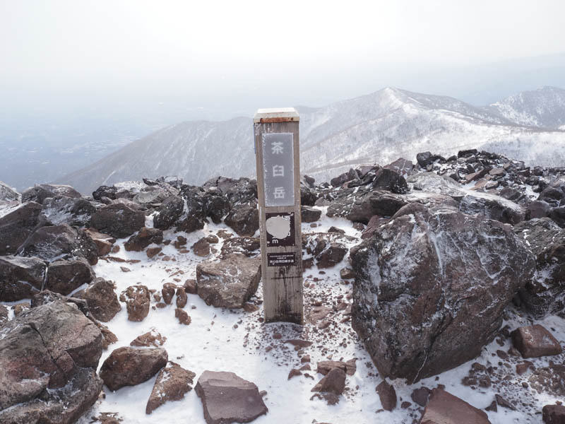 しばらくすると裏那須の山々の稜線にガスが掛かって見えなくなってきました。那須高原も徐々にガスに覆われて薄れていきます。そして粉雪も舞い始めました。うーん、登頂まで天気が持たなかったかー、と少し残念な気持ちになります。