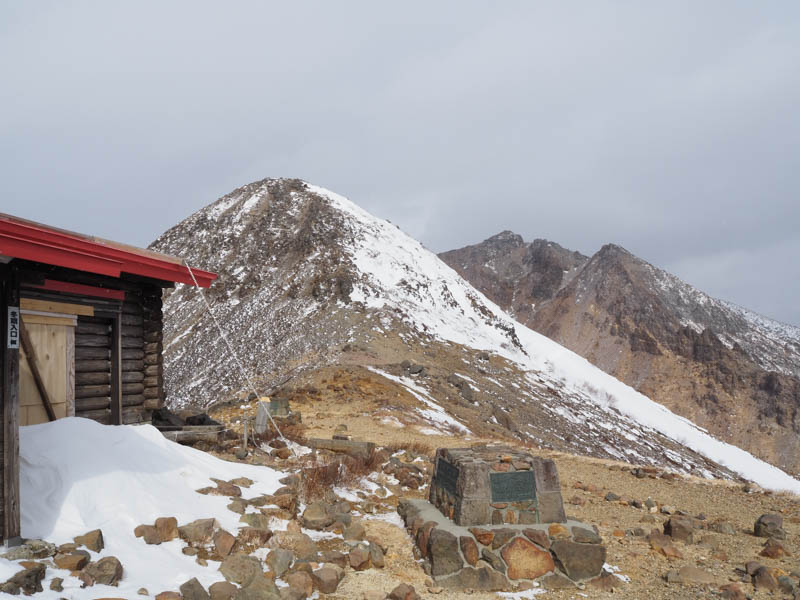 鞍部に戻ると、風が随分と穏やかになっていました。避難小屋の近くで小休止して、ピッケルを用意します。見る限り剣ヶ峰の斜度としてはダブルストックでもいけそうですが、念のため装備します。準備を終えたらいざ剣ヶ峰に向かいます。