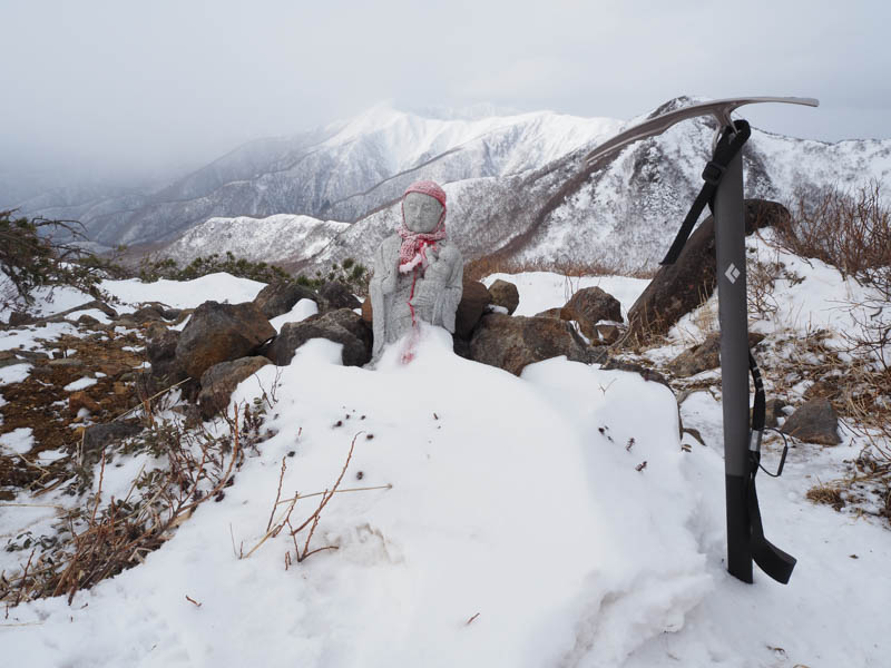 急登を終えると稜線上を歩いて山頂に向かいます。細い道で特に右手は雪の急斜面なので落ちたら大変です。しばらく歩くとお地蔵さまに出合います。谷の方を向いているので、正面から撮るには回り込まなくてはなりません。