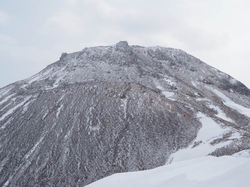 靴紐を結び直したら茶臼岳を登ります。最初は雪がほぼなくて岩だらけです。硫黄鉱山跡を過ぎて登っていくと、次第に雪が増えてきました。それでもそんなに厚くはないですね。山頂に近づくにつれて雪が弱まり、日差しも見え始めました。ガスも晴れてきて周りの山々や下界を望めるようになりました。真っ青な空とまでいきませんが、眺望が得られるだけで満足です。