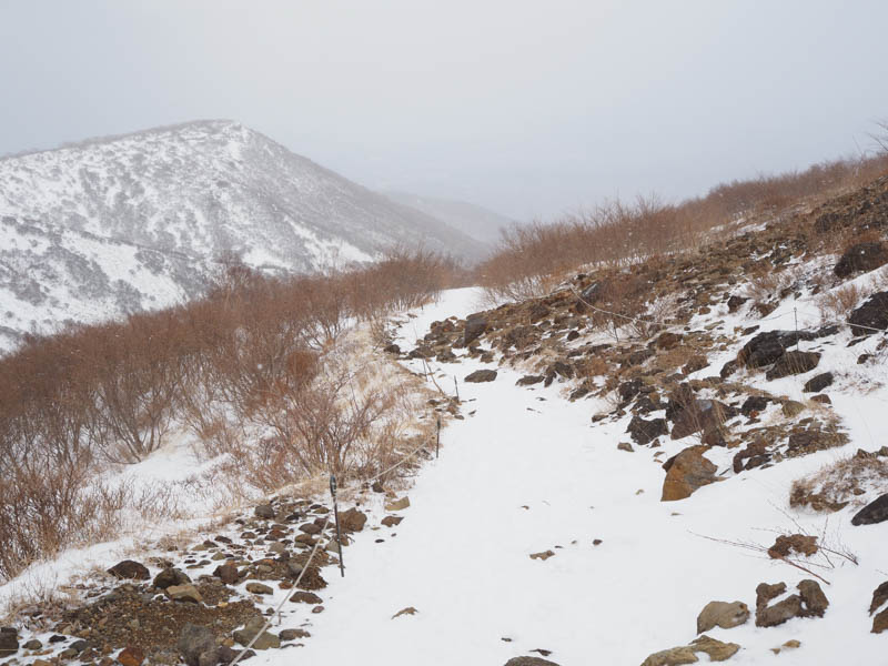 山頂時間を楽しんだら下山します。さすがに剣ヶ峰の下りは怖くて慎重に進みました。その後は登ってきた道をゆるゆると下っていきます。空はすっかり曇天で粉雪が舞っています。