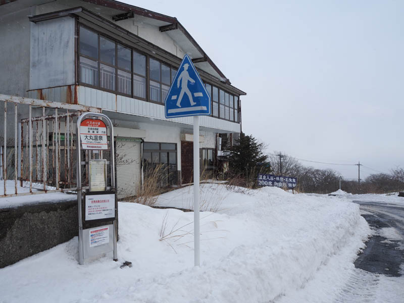 右足が回復したら、山行を再開し、大丸温泉まで下りました。大丸温泉はこの日は残念ながら日帰り営業はしていないので、装備を片付けつつバスを待ちます。降雪が強まってきて寒かったので、アウターシェルは着たままにしました。