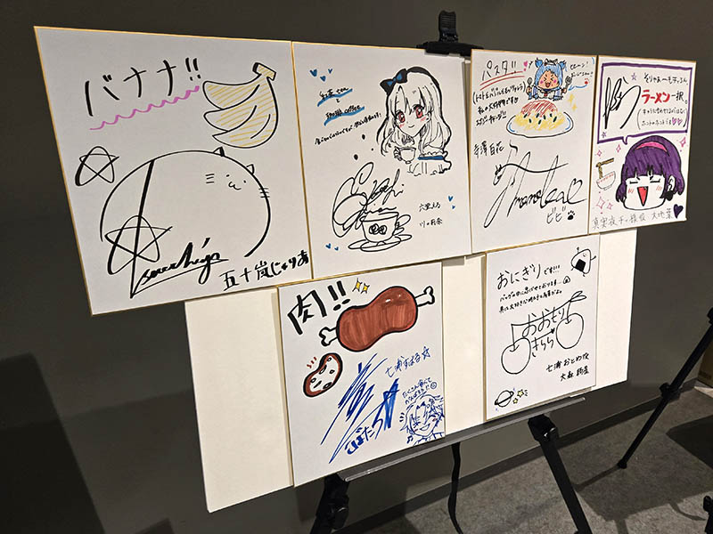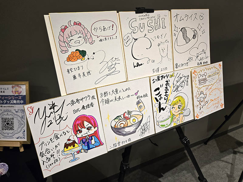そして物販スペースの列の横に、キャストが気合いを入れるときに食べる食べ物を描いた色紙が展示されています。前述の通りパンフレット内に掲載されているものの原画なので、物販スペースに展示されているのだと思いますが、物販に寄らないと見逃しちゃいますね。