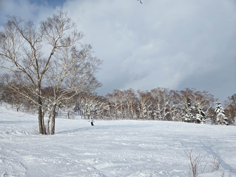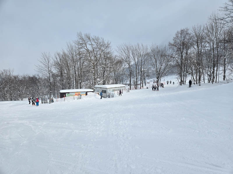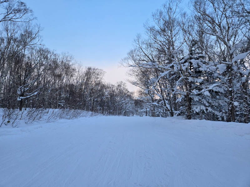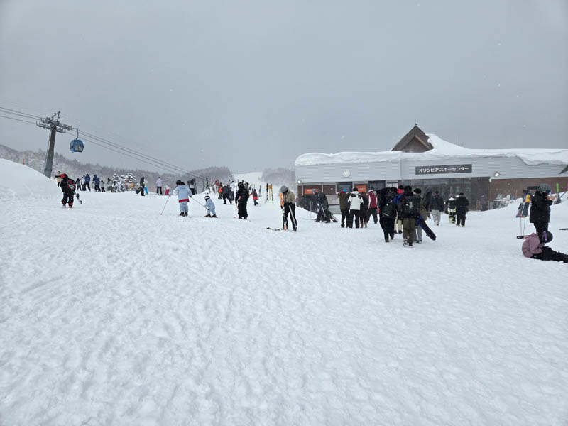 その後はスキー板のカバーケースを回収し、小脇に抱えてオリンピアスキーセンターまで戻ります。ハイランドとオリンピアはレインボーコースで繋がっているので、滑って戻れます。ただスキーセンターからは少しゴンドラ乗り場付近まで少し登る必要があります。レインボーコースは初級の林間コースで、思ったほど距離は長くなく、程なくしてオリンピアスキーセンターが見えてきました。
