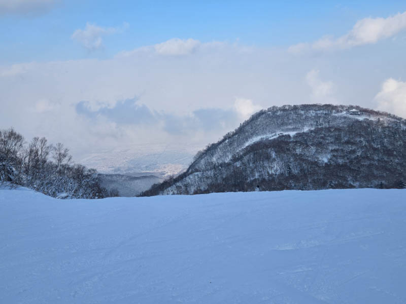 山頂に着いたらシティービュークルーズコースを回します。中級コースの終着地なのでリフトは空いていて良いです。それでいて且つコース長もそこそこあるので、ついつい回してしまいます。途中までは程よい斜度で、初級コースと分岐以降は斜度が増します。最初は足で強引に制動してしまい、疲れてしまいました。その後は荷重を意識して制動するように心がけました。