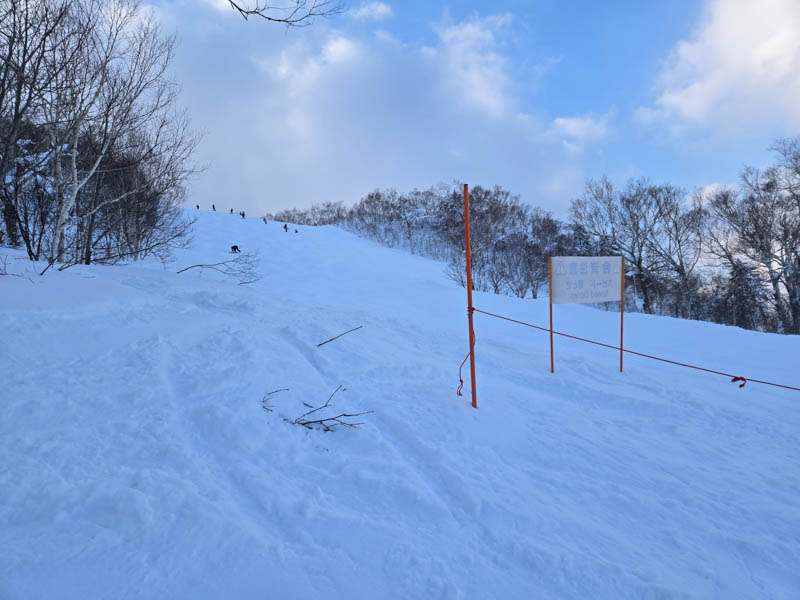 その後はシティービューパノラマコースを下ります。すると前方に明らかな急斜面が現れました。札幌オリンピックの女子大回転のコースです。コース案内を見ているとうっかり中級コースかと思ってしまうので怖いですね。まあ、見るからに入り口からやばいコースなので、うっかり迷い込むことはないでしょうけど。左右分岐ではなく、直進と右折の方が感覚に合っています。