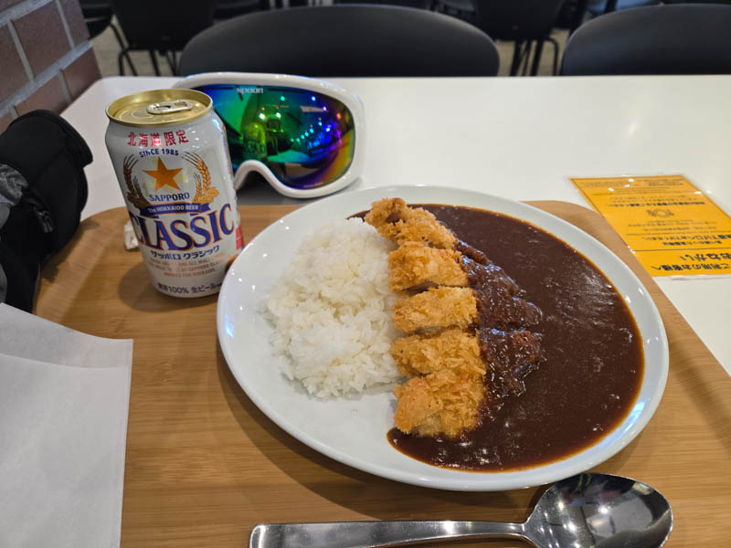 ハイランドスキーセンターまで戻ったら、遅い昼食をいただきます。生ビールは売り切れでしたので、カツカレーとサッポロクラシックの缶を注文しました。