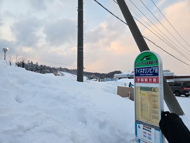2026年02月11日、サッポロテイネスキー場で滑ってきました。久しぶりの来訪となります。当日の朝新千歳空港に到着して、快速エアポートで直接手稲駅に向かいました。手稲駅に着いたら思ったより雪が降っていますね。改札を出たら南口のバス停に向かって待機列に並びます。インバウンド需要もあってか、存外人が多いです。テイネハイランドまで行くつもりでしたが、次のバスはテイネオリンピアまでしか行きません。うーん、事前に宅配したスキー板はテイネハイランドにあるので困ります。下調べ不足で全てのバスがテイネハイランドまで行くと思っていたのが失敗でしたが、ただ時刻表だとこの便はテイネハイランドまで行くはずなんですけどね。次のバスを待つのも微妙なので、テイネオリンピアまで移動します。