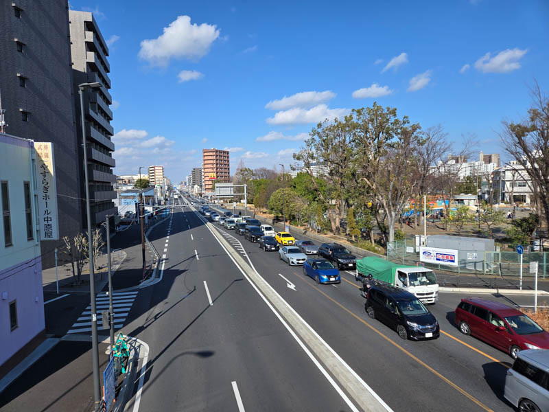 市電通りを走って国道1号線まで向かいます。市電通りは途中歩道が狭い場所があるので、車道に出られるように車道の左側を走ります。