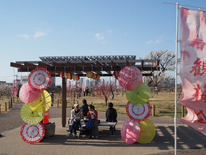 東屋も和傘で彩られていて華やかでした。青空の下のお花見はとても気持ちいいものです。メジロでも飛んできてくれたら最高でしたが、残念ながら今回は出合えませんでした。
