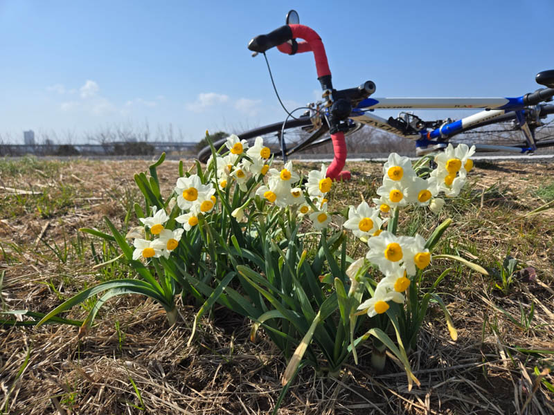 TXの高架を越えて道幅が広くなるところは、見晴らしも良くて気持ちいいですね。右手にニョキっと生えたスカイツリーを望みながら進みます。新葛飾橋を過ぎて葛飾橋の手前あたりで下道に降ります。ちょうど降りるところに水仙が咲いていました。