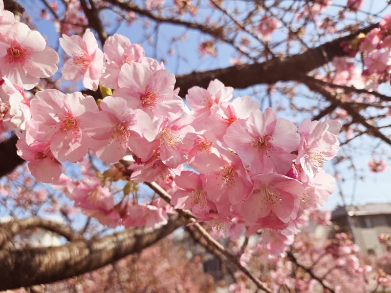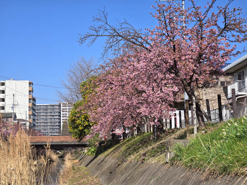 ここから旧坂川まで走ると、川沿いに河津桜が並ぶ光景を見ることができます。自転車を押しながらのんびりとお花見を楽しみました。端から端までゆっくり歩いて大体10分程度かと思います。程よい規模感で程よい人出でした。本当はミラーレス一眼で撮影するつもりでしたが、実家へ戻る際に自宅から持ってくるのを忘れてしまいましたので、スマホカメラで撮影です。細かい調整はできませんが、その分フィルタを色々と試してみました。