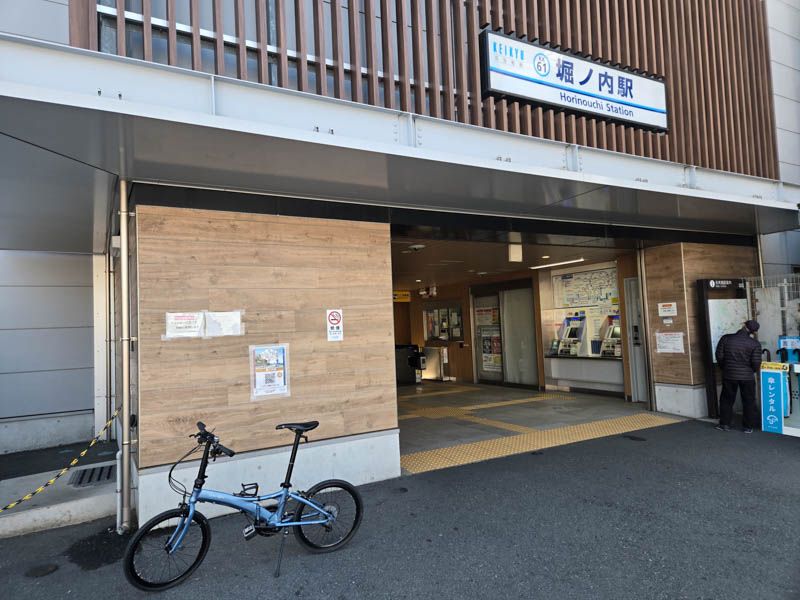 京急川崎から特急三崎口行きに乗車します。そこそこ人が多く、何とかスペースを確保しました。東海道線はこの時間の下りはわりと空いていましたが、京急線はまた違いますね。40分ほど乗車して堀ノ内駅で下車しました。