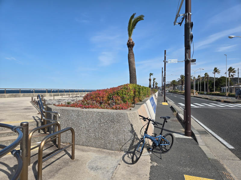 安浦下浦線からさらに海沿いに進み、よこすか海岸通りに入ります。海を左手に望み、道沿いにはヤシの木が立ち並んで、南国気分が上がります。海を間近に望める馬堀海岸遊歩道が隣にありますが、こちらは自転車の走行は禁止です。