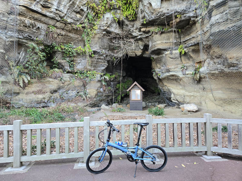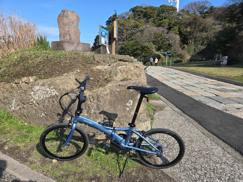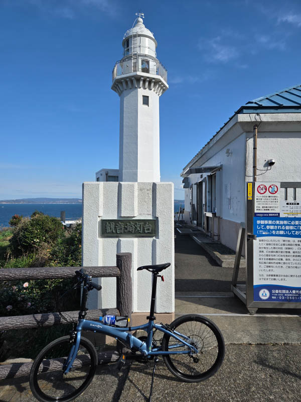 権現洞窟を見学したら、右手にある階段を登って灯台に向かいます。軽い折り畳み自転車とはいえ、これを持って階段を登るのは息が上がりますね。