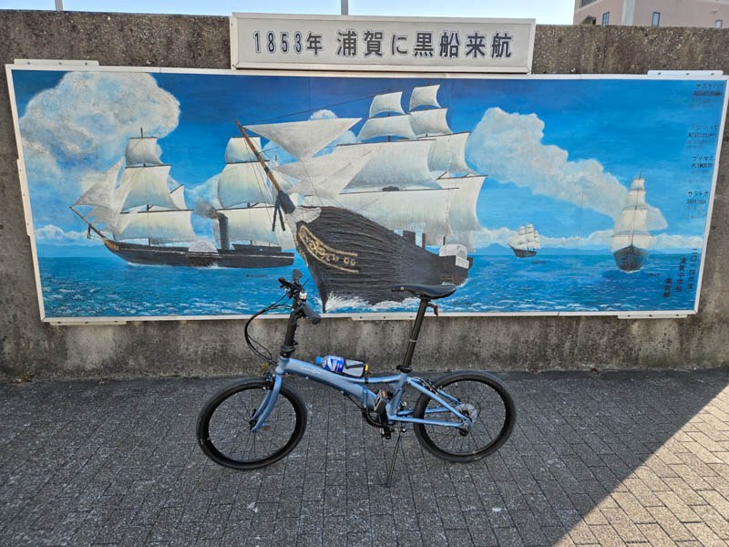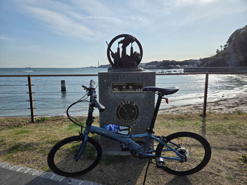 灯台の見学を終えたら、北門第一砲台跡のところから抜けて、観音崎通りを走ります。やがてたたら浜に出合いました。こちらには三浦半島自転車一周のサイクルマイルストーンの黒船があります。自転車と一緒に記念撮影しました。