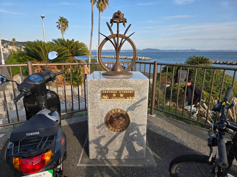 野比海岸公園まで来ると、サイクルマイルストーンの水仙があります。こちらはマイルストーンのある場所が駐輪場のようになっており、他の自転車が多く止まっていて、自分の自転車との記念撮影は無理でした。