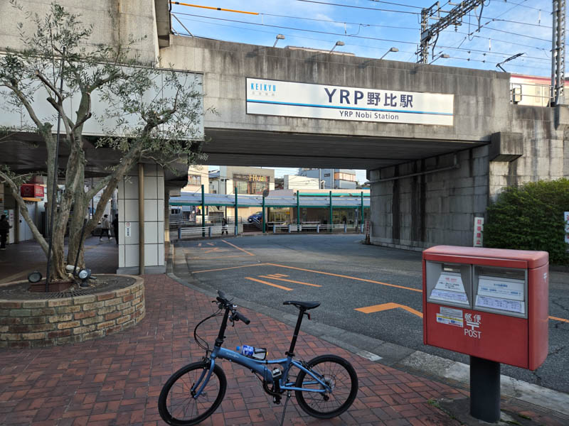 その後は野比交差点を渡って県道27号に入り、YRP野比駅前に出ました。これまでその特徴的な駅名を見る機会はありましたが、ついに使う時がやってきました。駅前は電車やバスの発着に合わせて、人の往来が多少ありますが、自転車のパッキングは特に問題なく行える程度です。
