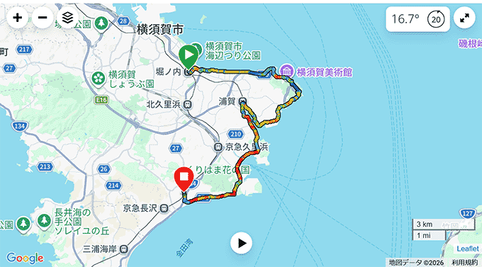 堀ノ内駅から出発して、三浦半島を海岸沿いに走り、YRP野比駅で離脱しました。三浦半島6分の1周くらいですかね。色々と観光スポットが多いので、ついつい寄り道が増えてしまいます。