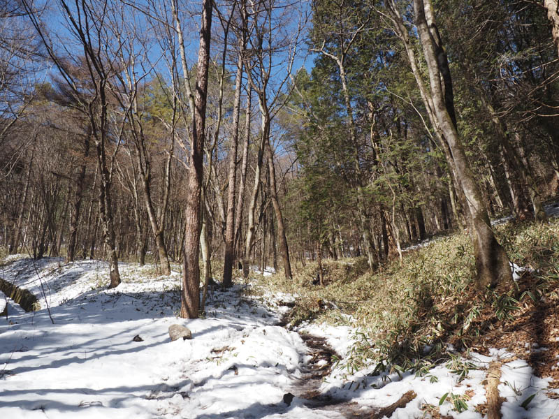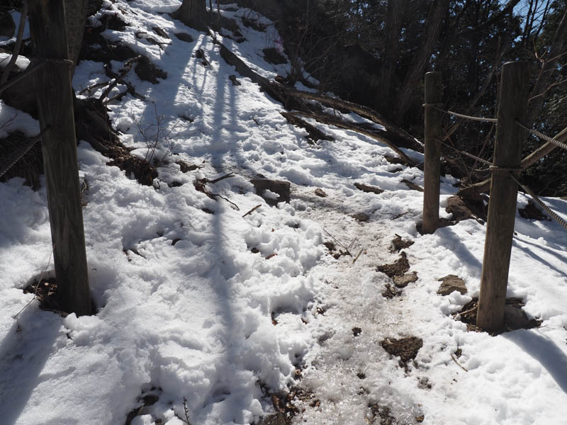 トイレですっきりしたところで再び登山口へ向かい、山行開始です。さっそく雪がありますがつぼ足で進みます。日陰で踏み固められているので、アイスバーンとなっている箇所も多く、少しひやっとする場面もあります。