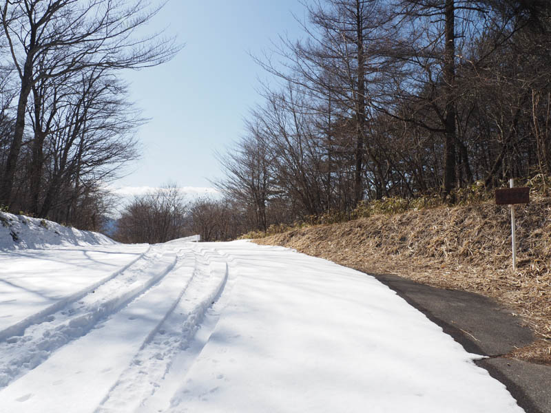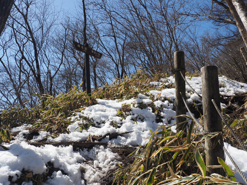 山頂に近づくと木々の数が減り、日が当たりやすくなってくるためか、雪がだいぶ融雪していて茶色い地面が露出するようになります。