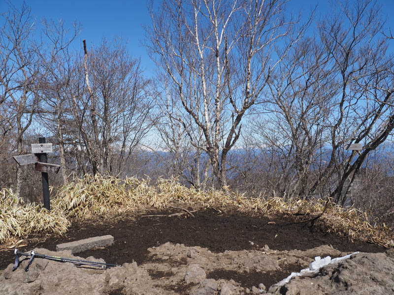 そしてついに掃部ヶ岳の山頂に着きました。山頂はそこそこの広さはありますが、大勢が休憩できるほどではありません。南に展望が開けますが、榛名湖は見えません。少し手前にある展望スポットで見ておくのが良いでしょう。山頂標はありますが、案内板とセットだったり、掛札だったり、さほど立派な感じではありません。文字に色も付いていないので、写真に撮ってもぱっと見分からなかったりします。ここで昼休憩にしようかと思いましたが、掃部ヶ岳は少ないながらも人が来そうなので、ひとつ奥の西峰まで向かいます。まあ、下山者としか出会っていないのでこの後登ってくる人はいなかったかもしれません。