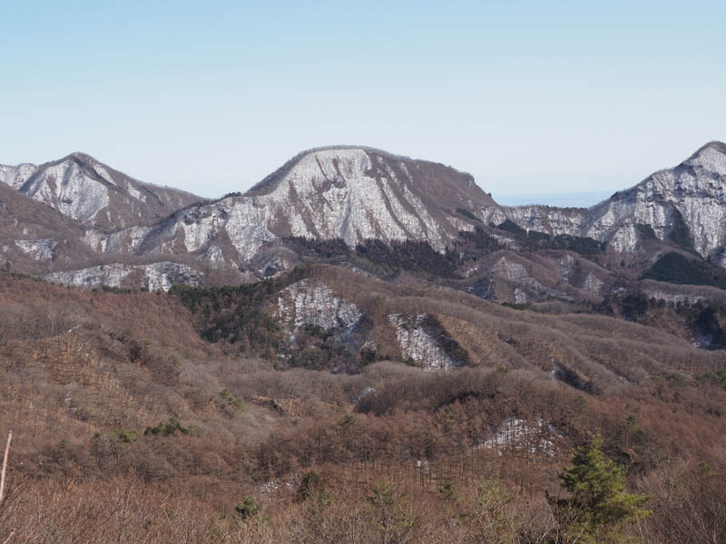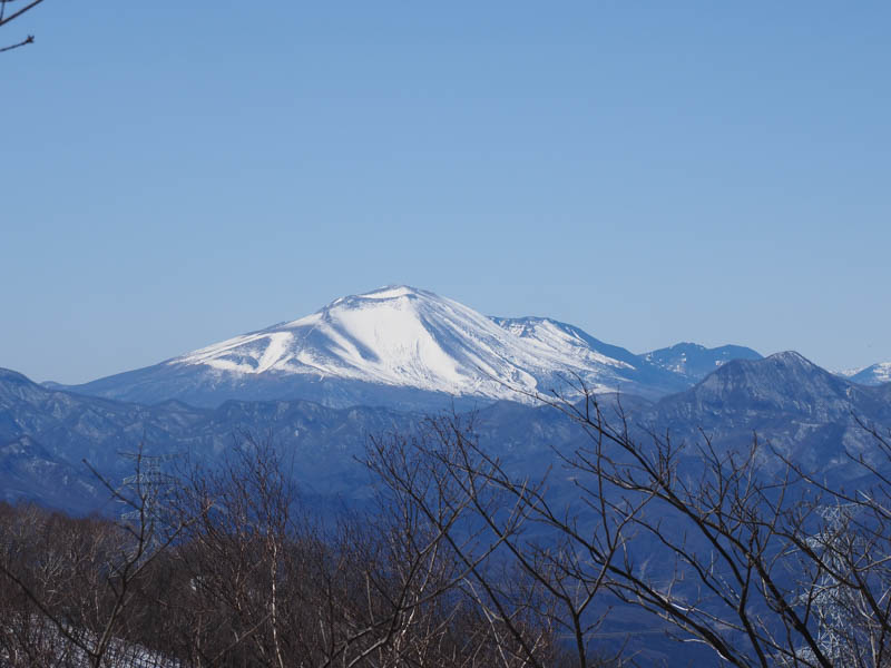 笹に囲われた道を下って行きます。笹で道が見えないという情報を事前に得ていましたが、冬場だからか道は明瞭でした。遠くには一際白く雪化粧を纏った浅間山の姿を望めます。