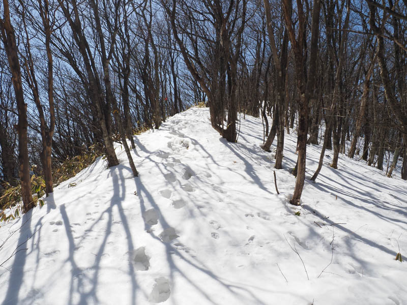 下りきって鞍部に差し掛かり、再び登りになると一気に雪が深くなりました。西斜面は融雪が進んでいますが東斜面は雪が多く残っていますね。ワカンが欲しくなるところですがトレースがあったのでありがたく頂戴しました。全くトレースがなかったら短距離とはいえ、体力を奪われたと思います。