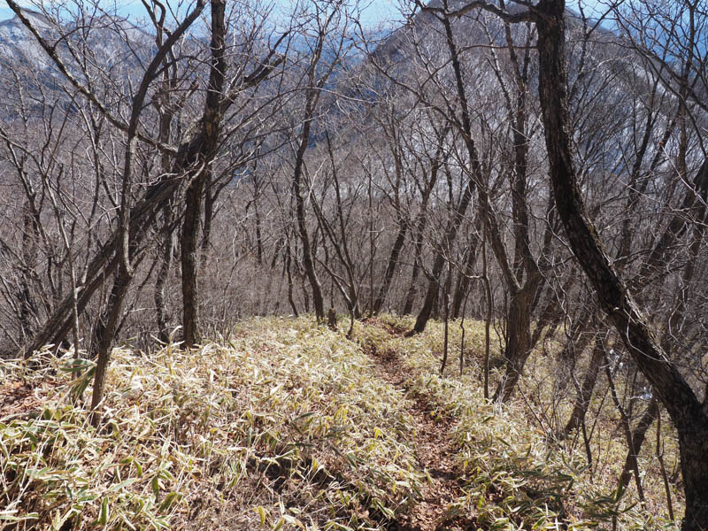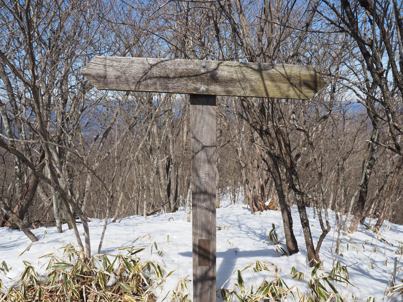 引き返したら分岐を杖の神峠方面に下ります。結構な急坂で一気に標高を下げていきます。ここの斜面は雪はほぼ残っていませんでした。