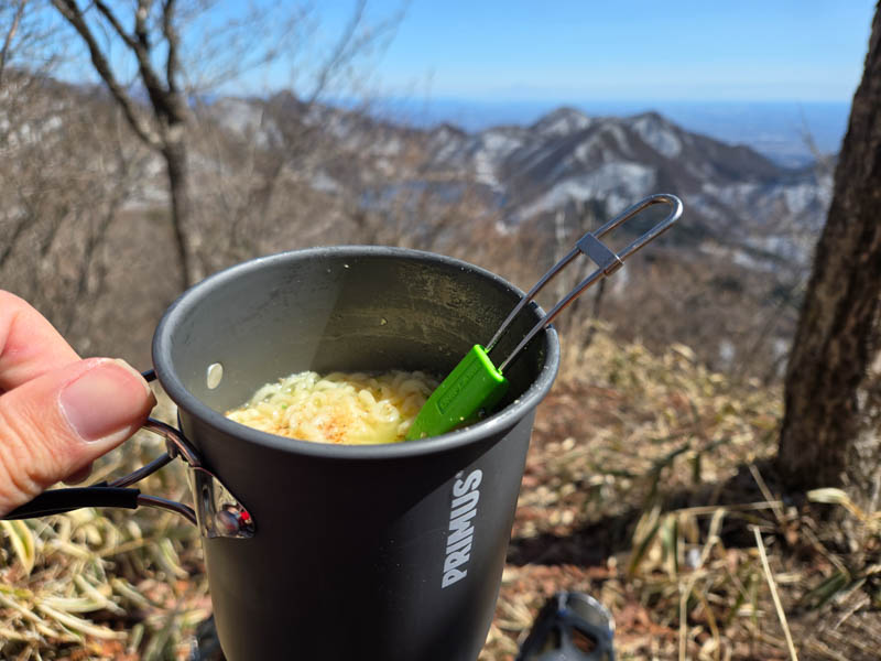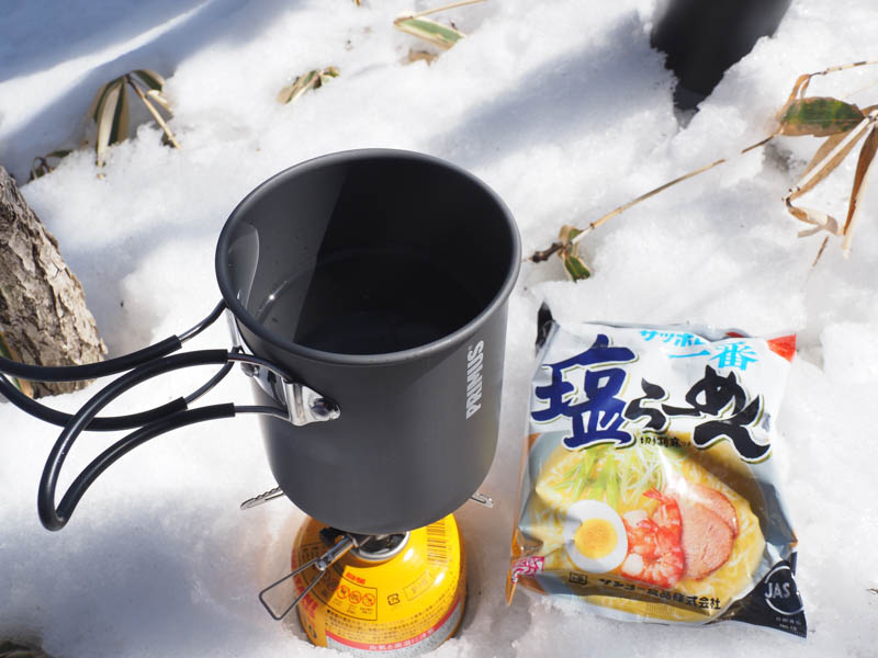 今回はガスバーナーデビューです。前述の通りあまりスペースがなくて枯れ草も多いので、雪の上に設置しました。事前に組み立てと点火までは予習していましたが、火力調整は把握していなかったので、湯を沸かすまで時間が掛かってしまいました。慎重になってガス栓を少ししか開いていなかったせいです。今回はサッポロ一番塩ラーメンを調理しました。そのままだと入らなかったので、2つに折って入れました。これまで山専用ボトルに入れたお湯で調理をしてきましたが、お湯の熱々感が当然ながら段違いで感動しました。天気も景色も良いので、食事をしながらまったりと楽しみました。