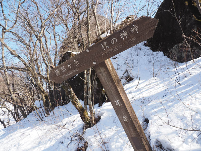 杖の神峠を目指して先に進みます。この時期にここまで来る人は多くないようで、雪がしっかり残っています。途中、耳岩という巨岩スポットがあります。登ることが出来るみたいですが、チャレンジせずに見るだけに留めました。てっぺんまで進むにはクライミングの心得がないと難しいようです。ここは巨岩が南方向に立っているので日が当たらず、特に雪が深かったです。