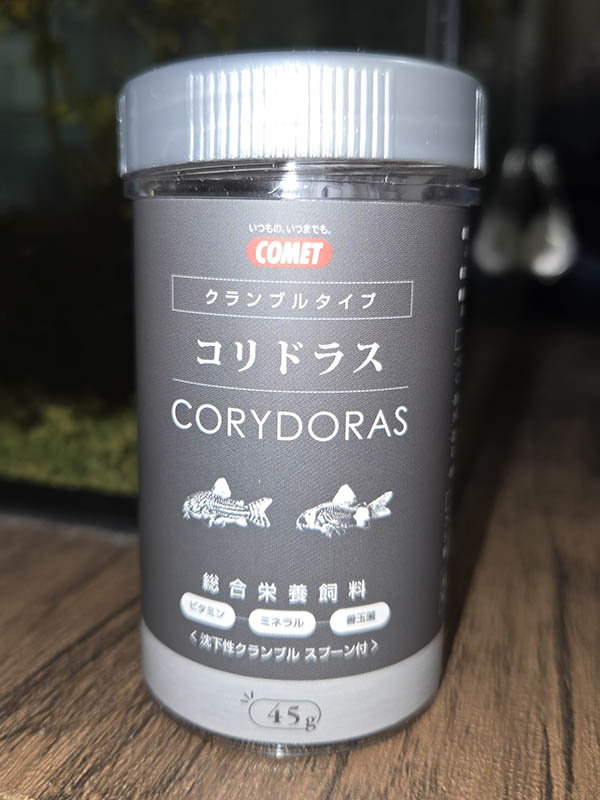 併せてコリドラス用の餌を買いました。これまでグッピーの餌を使ってきましたが、相当前に賞味期限が切れているものです。乾燥餌ですし消費期限ではないので問題ないと判断していましたが、これを食べたカージナルテトラが食後しばらく沈みにくそうな素振りを見せるようになりました。最初は2匹のうち1匹だけでしたが、ついに2匹とも同じ動きを見せるようになったので、さすがにマズいと判断しました。