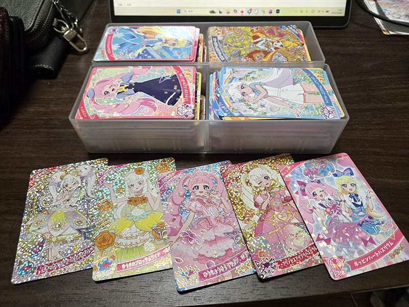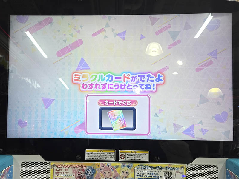 ひみつのアイプリ筐体は、リング編に入ってからも全弾遊びました。毎月第1週のカード配布目当てにゲームセンターへ出かけて、20クレくらい回すルーチンです。だいたい10クレで星4カードが1、2枚出るので、そのサイクルを基準に回しています。全カード回収はとても無理ですが、各弾5~10枚の星4カードは入手できたと思います。ミラクルカードはあまり出ませんでしたが、最終弾では5クレ内に2枚出て神引きでした。