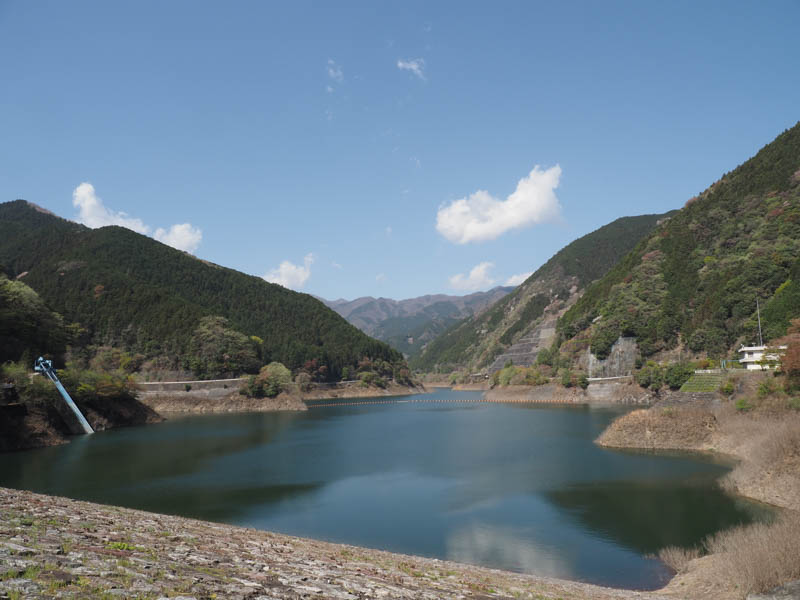 まずは舗装路を登っていきます。そこそこ車の往来があるので気を付けつつ進みます。坂を登りきったところで、目の前に壮大な有間ダムの光景が広がります。青空と新緑とダム湖に彩られた景色が気持ちいいです。バイカーの方達が愛車との記念撮影を楽しんでいました。