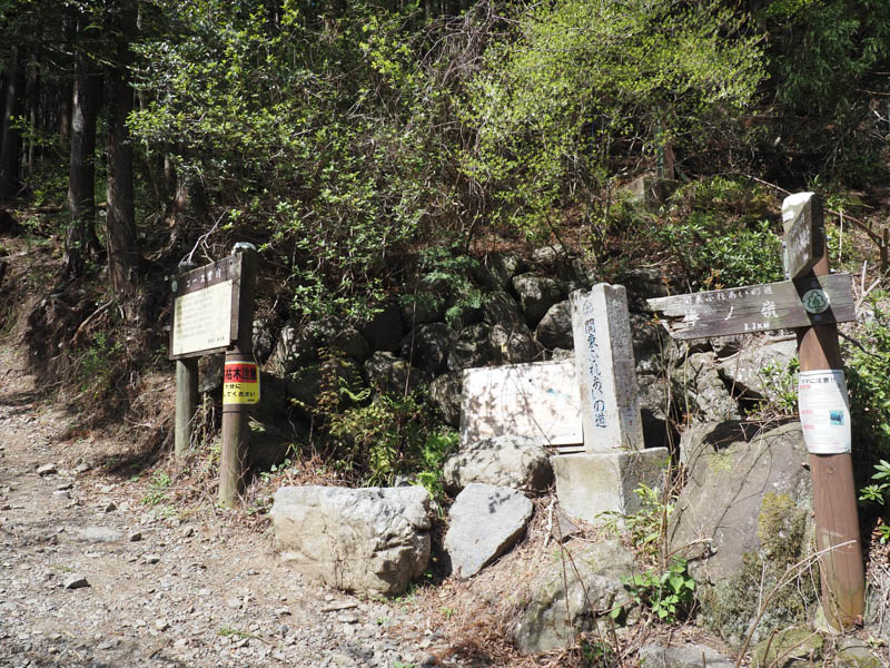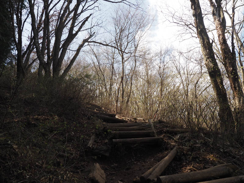 ここからゴンジリ峠に向けて急坂を登ります。中央にある階段は何やら使ってはいけない様子です。説明をしている票が破損していて事情は読み取れませんでしたが、ロープが張られていました。というわけで階段の脇に設けられた登山道を登っていきます。急坂ですが距離はそこまで長くはなく、程なくしてゴンジリ峠に到着しました。