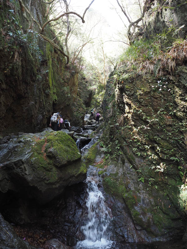 さらに進むと両側を切り立った岩に囲まれたゴルジュ帯に出合います。沢の水流は大したことありませんが、岩が濡れて滑るので注意して登ります。ロープや鎖、足場も作られているので、それらを的確に活用すれば難しいところはありません。