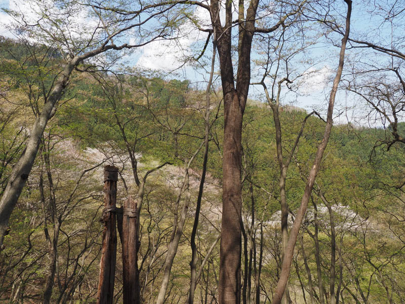 一旦林道に出たら再び山道を登ります。長い階段が続いており、脚力を削られます。ここを頑張って登りきると、満開の山桜が景色を彩ってくれます。