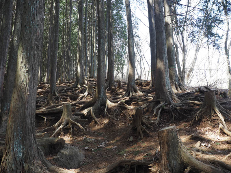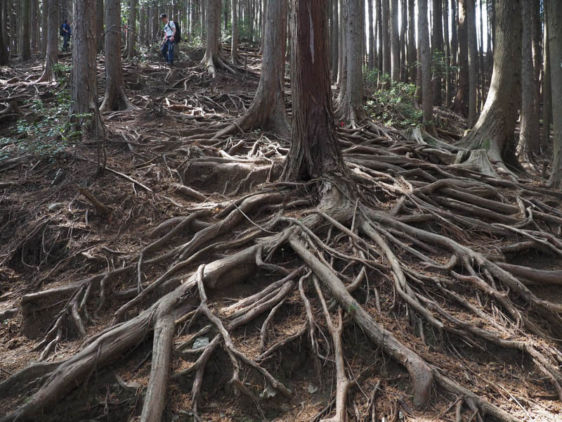 何度か林道を挟みつつ、徐々に下っていきます。途中、木の根が張り巡らされた道を下りますが、振り返るとなかなか迫力があります。もう少し掛かるかな、と思っていたら、意外と早く車の走行音が聞こえてきました。樹林帯の中を黙々と下っていき、ついに下山完了です。