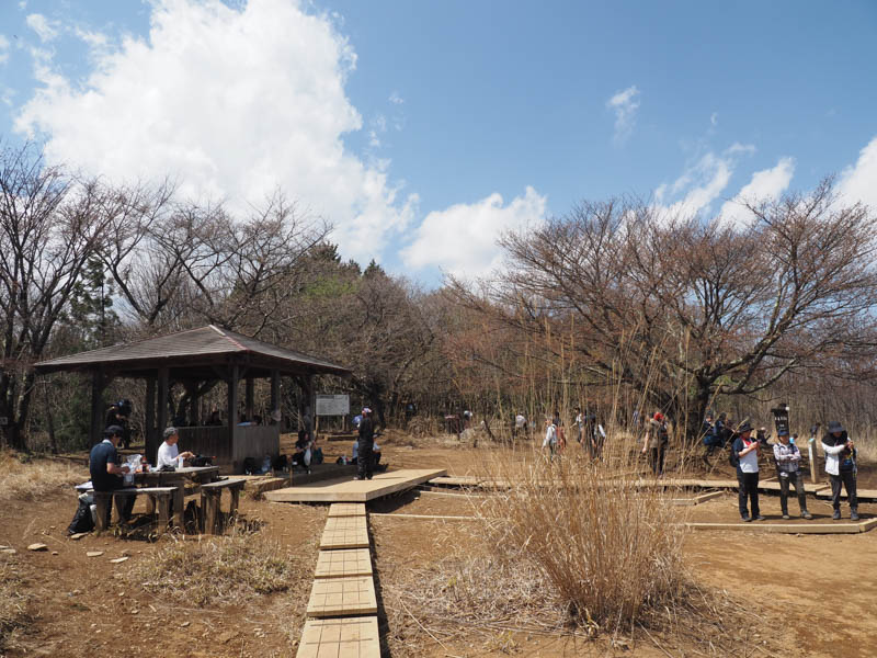 山頂はかなり広くて、東屋やたくさんのベンチがあります。展望は北側に開けていて、秩父山地や奥武蔵山地、平地に広がる街並みを望めます。南側は木々があったので行きませんでしたが、都心も望めるらしいので開けた場所があったのかもしれません。